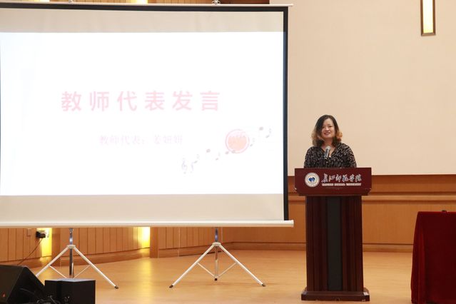 教师代表姜妍妍老师寄语新生。在发言中,姜老师提到,在大学里,不仅仅是完成课业、通过考试,更重要的是形成积极进取的人生态度,以及养成独立思考、理性行为的习惯。最后为同学们提出了一些建议,希望同学们通过付诸行动,努力接近自己的目标。