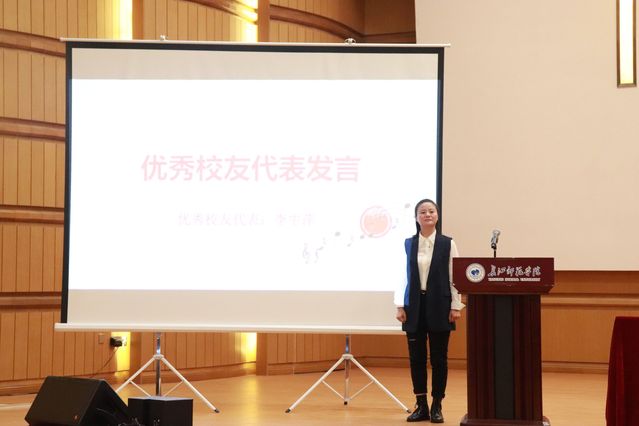 优秀校友代表李中萍老师进行发言。从母校毕业21年的李中萍老师,怀着无比激动的心情来参加此次开学典礼。发言中,李中萍老师回顾了学院的过往并分享自己的感想。感叹道,在学院二十多前的一切仿佛就在昨天,也衷心希望大家珍惜当下如此优越的学习条件,坚持努力、不负青春。