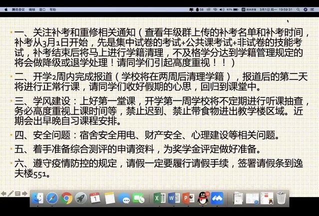 开学当天,辅导员在南大门工作点对返校学生依次进行体温检测、信息核实和入校签到等工作,并在当晚开展线上年级大会和班会。辅导员在会议上纷纷作出强调,一是提醒参加补考的同学注意补考时间,严肃考风考纪;二是强调要抓好疫情常态化工作,严格校门管理;三是鼓励同学们在疫情防控常抓不懈的情况下,合理安排学习进度,抓紧时间学习;四是排查各种安全隐患,注意宿舍用电安全、财产安全,关注心理健康等问题。