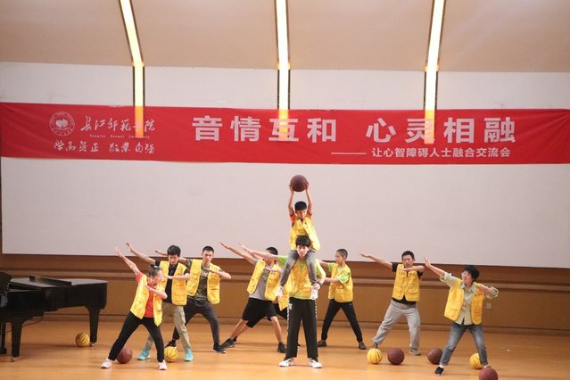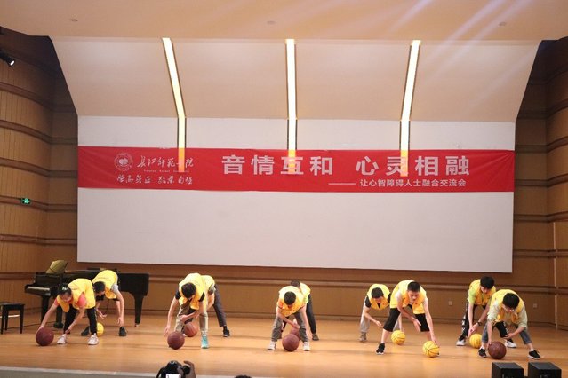 随着音乐的响起,康复中心的孩子们手中的篮球变得鲜活,他们通过感受音乐的节奏与韵律,在舞台上努力、快乐地展演节目,无不让台下观众拍手叫好。