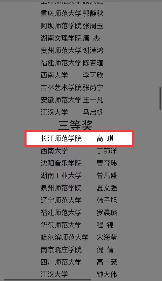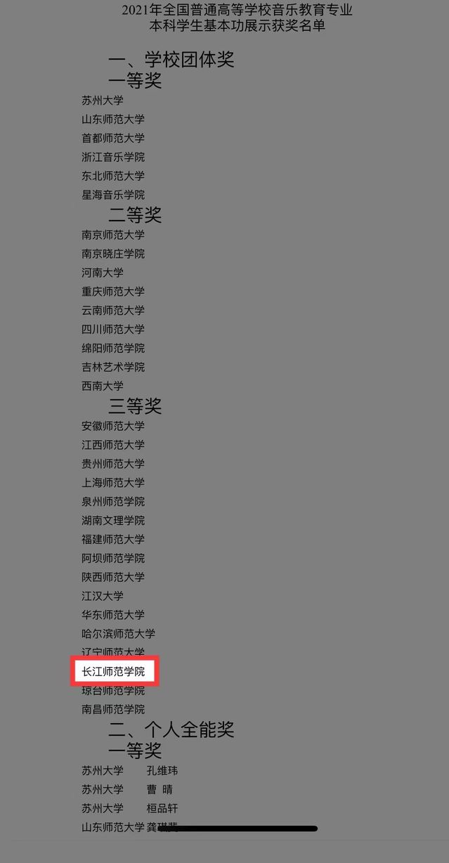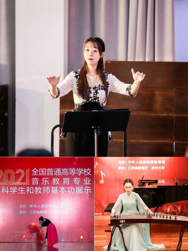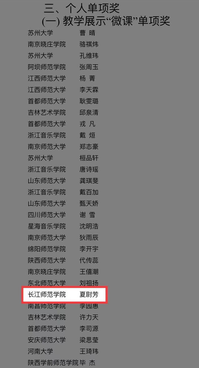 2021年10月18日-22日,由教育部主办、江苏省教育厅和苏州大学承办的2021年全国普通高等学校音乐教育专业本科学生和教师基本功展示活动在苏州大学音乐学院隆重举行。来自全国31个省(市、区)和新疆生产建设兵团的88所高校的225位参展教师,全国63所高校的189位参展学生参加本次展示活动。在近期公布的评选结果公示中,我院师生分别获得学生个人全能奖三等奖(高琪)、学生教学展示“微课”单项奖(夏尉芳)、教师个人全能奖三等奖(于良平),以及学校团体三等奖(长江师范学院)。