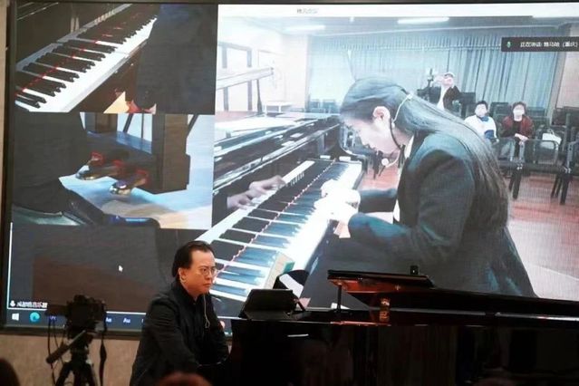 下半场是著名钢琴家唐哲教授大师课,唐哲教授是上海音乐学院钢琴系教授,博士生导师,教育系主任,上海音协钢琴专业委员会主任,国家双一流高校建设项目首席教授,美国纽约大学等中外院校客座教授。本次活动以线上远程和线下两种方式进行教学。