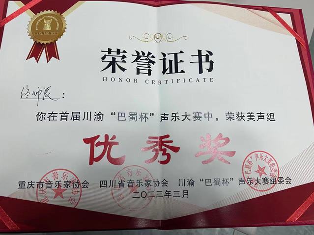 3月25日晚,首届川渝“巴蜀杯”声乐大赛正式落幕。我院2019级音乐表演专业学生佟帅辰、2020级音乐表演专业学生陈奥琳在首届川渝“巴蜀杯“声乐大赛中喜获佳绩。佟帅辰获得美声组优秀奖,同时是进入美声组决赛的12名选手中唯一本科在校生,陈奥琳荣获流行组优秀奖。