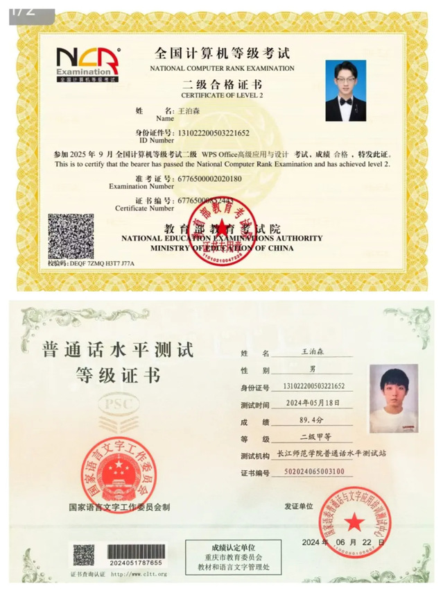 2024年6月 ,获普通话水平测试二级甲等等级证书;