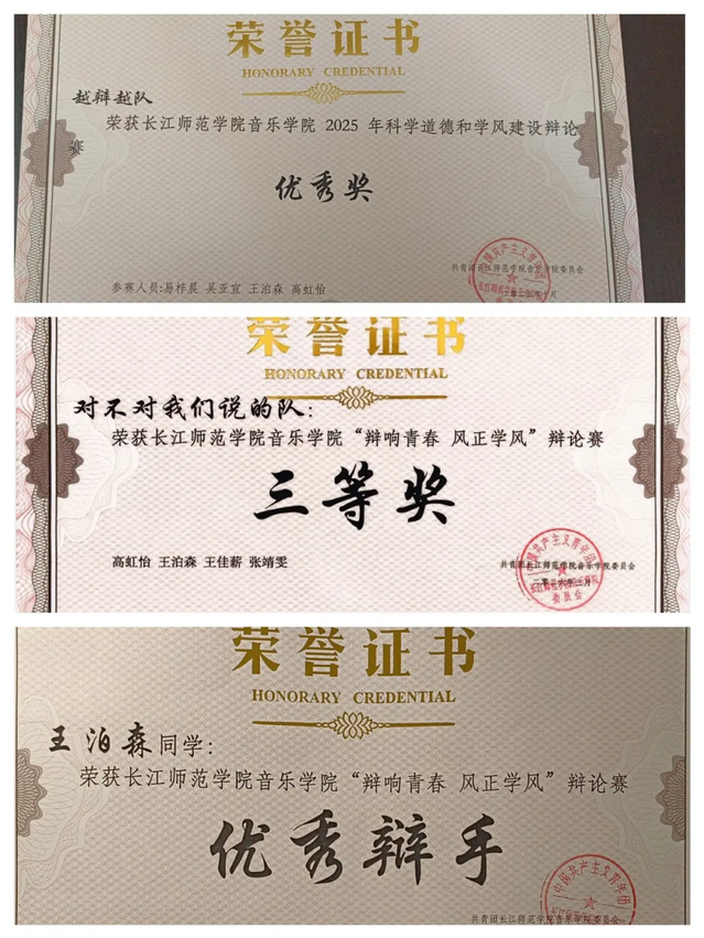 2025年10月,获音乐学院“科学道德和学风建设”辩论赛团队优秀奖;