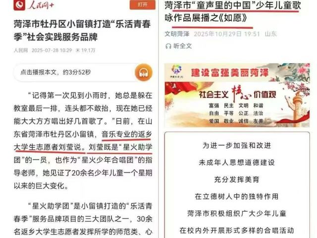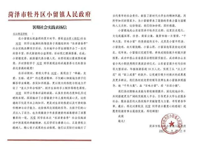 从重庆到山东菏泽,从校园课堂到乡村一线,我院23级音乐学专业学生刘莹,用连续两个寒暑假的坚守,书写了一段关于奉献与成长的青春故事。她积极响应学院号召,投身“返家乡”社会实践,将专业所学化作点点星光,不仅照亮了乡村孩子的童年,更赢得了家乡政府的高度赞誉,成为我院“三全育人”成果的生动缩影。