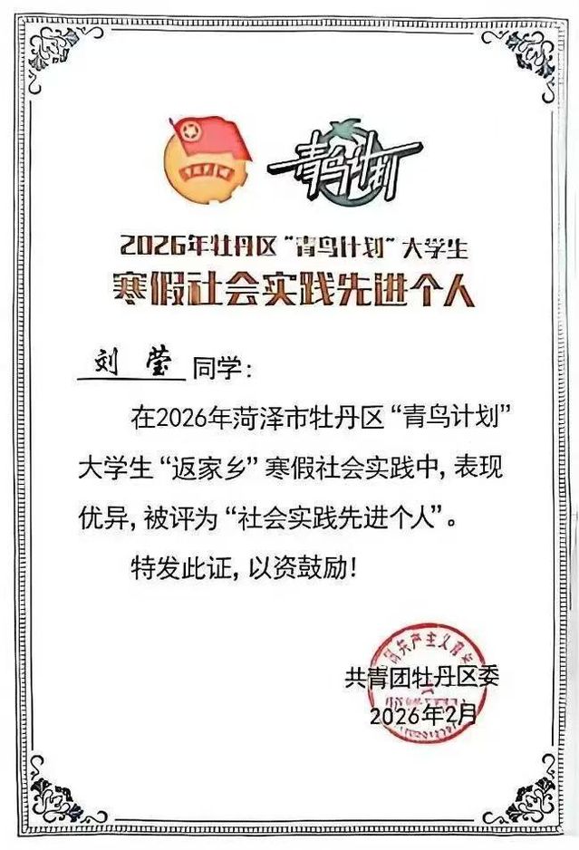 她再度集结“星火少年合唱团”,带领孩子们登上小留镇马年“村晚”的舞台。当纯净的童声在乡村夜空中响起,那份真挚的新春祝福,深深打动了在场的每一位父老乡亲。活动结束后,小留镇党委、政府再次发来感谢信,信中写道:“刘莹同学以青春洋溢的面貌、认真负责的态度、扎实过硬的本领,深深感染了我镇每一位青少年。她与志愿者们传递的是对生活的热爱、团队协作的意识与勇于探索的精神。”她本人也因在“青鸟计划”中的突出贡献,荣获“先进个人”称号。